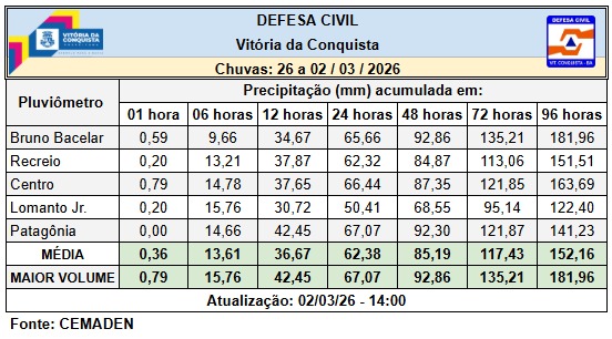 O grande volume de chuvas registrado nos últimos dias em Vitória da Conquista tem provocado alagamentos, quedas de árvores e danos estruturais em diversos pontos do município. De acordo com o boletim da Coordenação de Proteção e Defesa Civil (Compdec), com base nos dados do Cemaden, a cidade registrou uma média de 62,38 mm de precipitação nas últimas 24 horas. O maior índice foi captado pelo pluviômetro do bairro Patagônia, com 67,07 mm. O volume acumulado desde a última quinta-feira (26) chega a 152,16 mm.