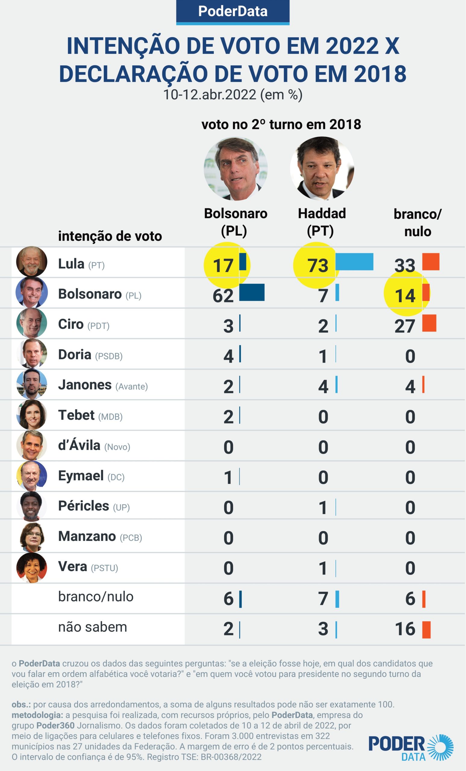 A última pesquisa PoderData, divulgada na semana passada, aponta que 62% dos eleitores que votaram no presidente Jair Bolsonaro (PL) em 2018 têm intenção de repetir seu voto na eleição de 2022. O levantamento foi realizado de 10 a 12 de abril.