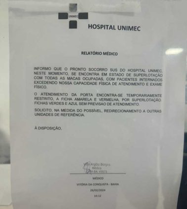 A Unidade Médico Cirúrgica (Unimec) de Vitória da Conquista passou a restringir os atendimentos por conta de uma superlotação de pacientes. Por meio de um comunicado fixado no hospital, foi declarado que “o pronto socorro SUS do Hospital Unimec, neste momento, se encontra em estado de superlotação, com todas as macas ocupadas com pacientes internados, excedendo nossa capacidade física de atendimento e exame físico”.