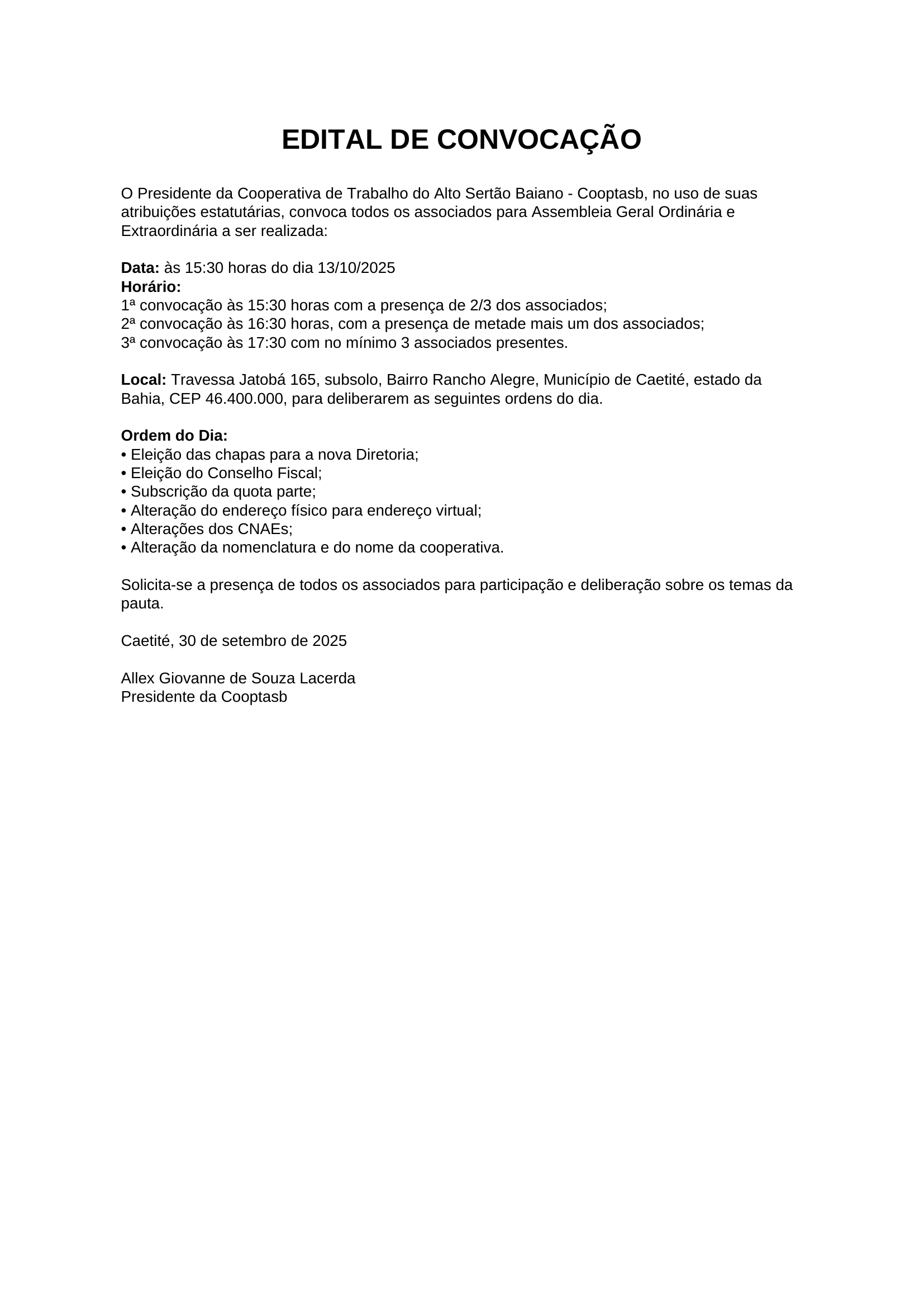 O Presidente da Cooperativa de Trabalho do Alto Sertão Baiano - Cooptasb, no uso de suas atribuições estatutárias, convoca todos os associados para Assembleia Geral Ordinária e Extraordinária a ser realizada: