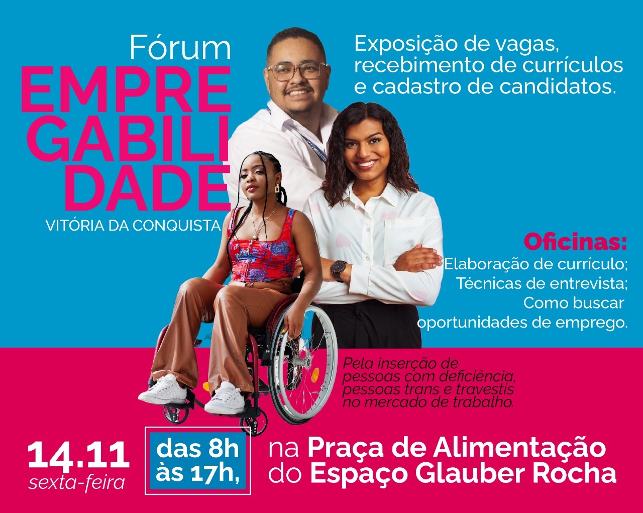 Com o objetivo de ampliar as oportunidades de inserção de pessoas com deficiência (PCDs), pessoas trans e travestis no mercado, o Fórum vai reunir empresas, instituições públicas e candidatos em um espaço de diálogo, aprendizado e conexão. Mais do que um evento, é uma oportunidade concreta de romper barreiras e valorizar talentos que, muitas vezes, são invisibilizados pela sociedade.
