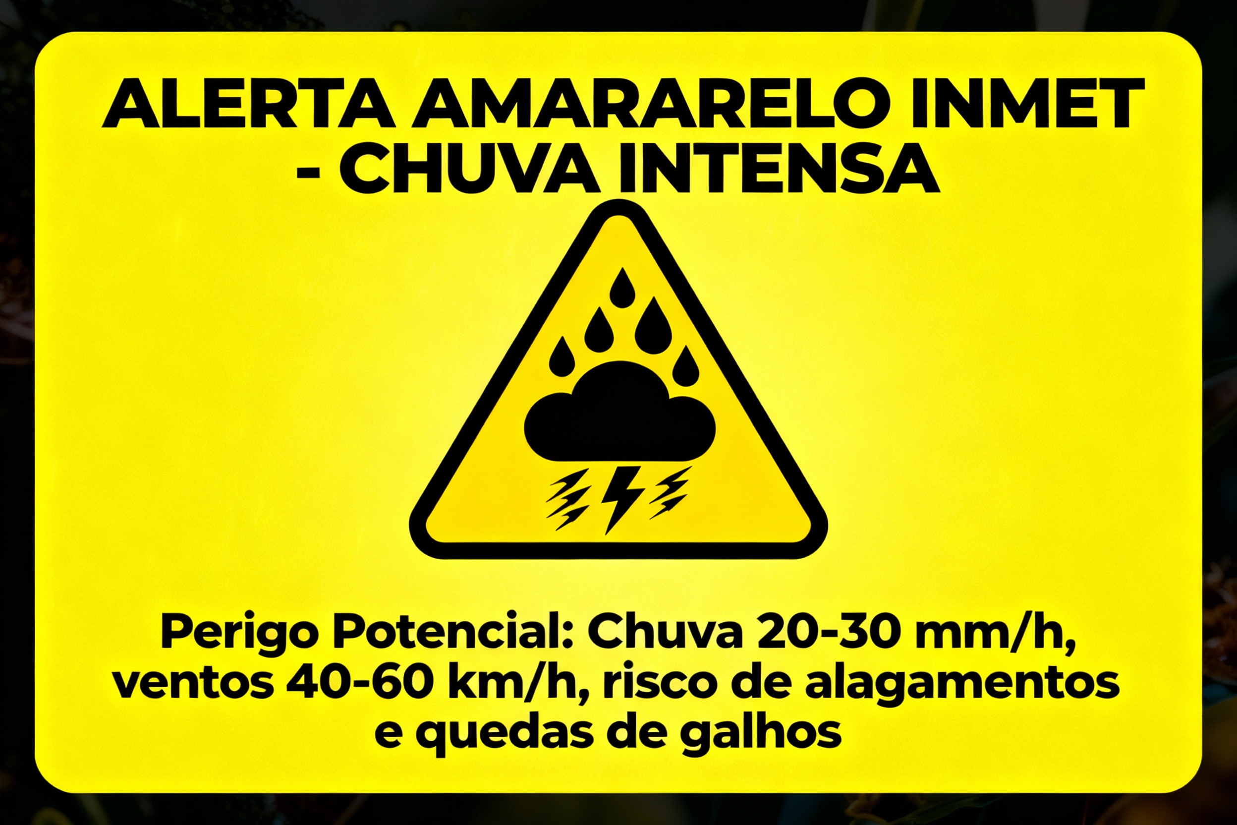 O Alerta Amarelo, classificado como de Perigo Potencial, prevê precipitações entre 20 e 30 milímetros por hora, ou até 50 mm por dia, acompanhadas de ventos entre 40 e 60 km/h. Nesse cenário, há baixo risco de corte de energia elétrica, queda de galhos, alagamentos pontuais e descargas elétricas.