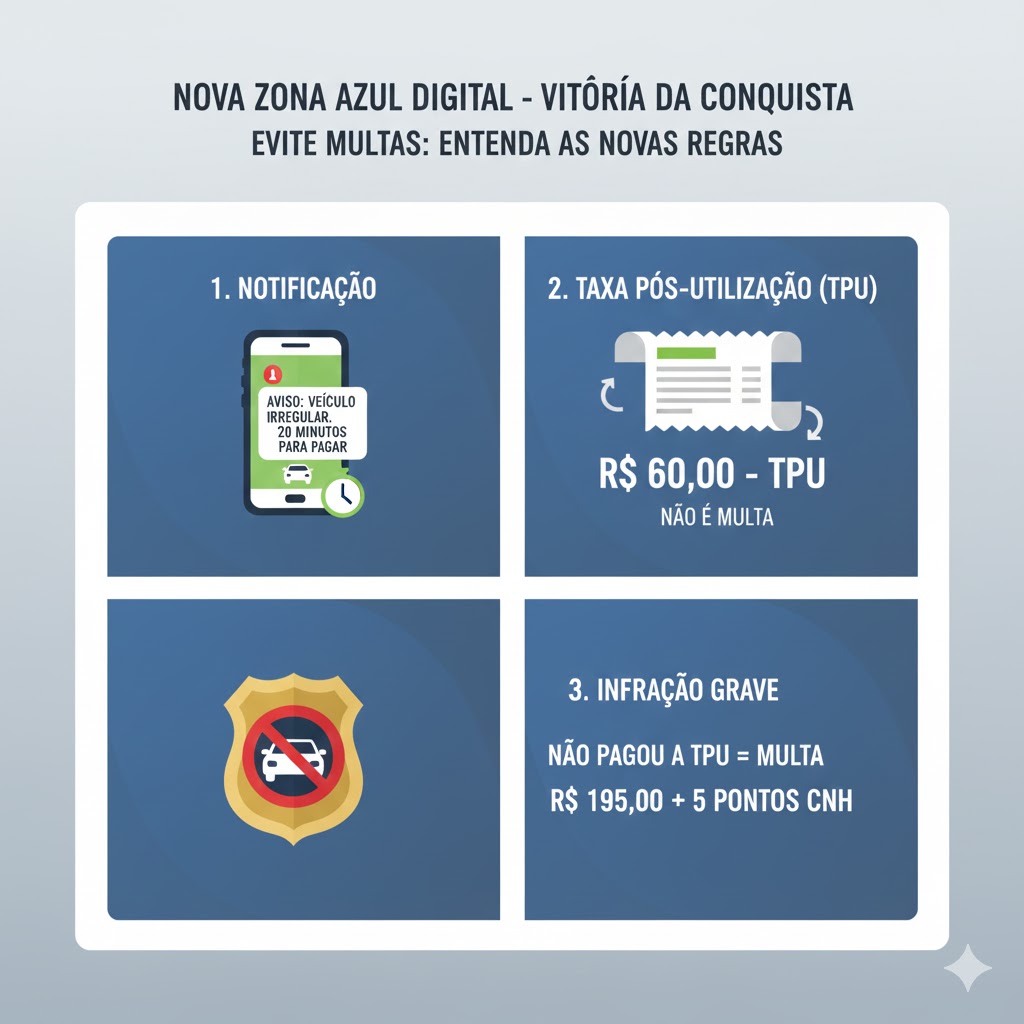 A maior novidade do sistema é o caráter educativo e preventivo de cobrança. Anteriormente, estacionar sem crédito resultou imediatamente em infração grave. Agora, o processo é escalonado:
