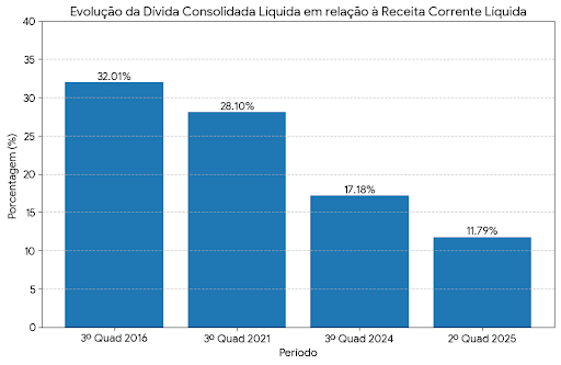 A Mega Rádio preparou um gráfico de barras ilustrando a evolução da redução da dívida municipal (relação Dívida Consolidada Líquida / Receita Corrente Líquida) entre 2016 e 2025.