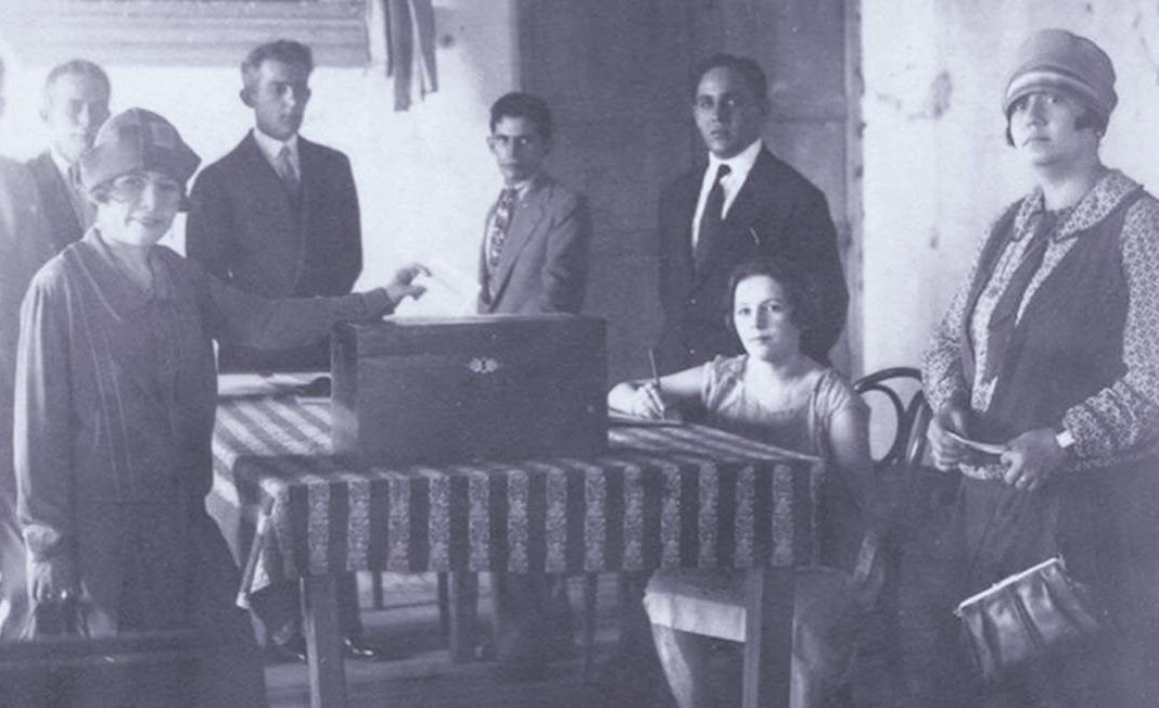 Celina Guimarães Viana (em pé, à esquerda) foi a primeira mulher a votar no Brasil, no Rio Grande do Norte, cinco anos do direito ser assegurado em todo o país. Foto: Reprodução/Agência O Globo