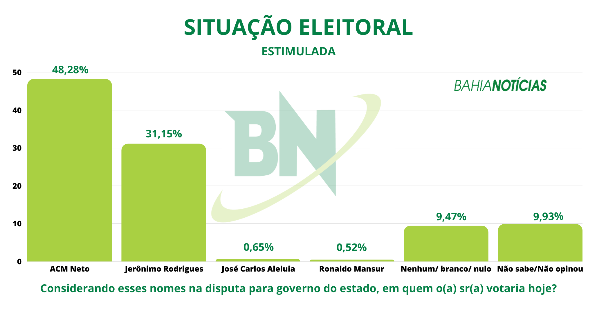 A pesquisa também perguntou em qual candidato o eleitor não votaria de jeito nenhum. Nesse quesito, o governador Jerônimo Rodrigues aparece com a maior rejeição, sendo citado por 37,96% dos entrevistados. ACM Neto tem 22,65% de rejeição, seguido por Ronaldo Mansur (6,42%) e José Carlos Aleluia (5,71%).